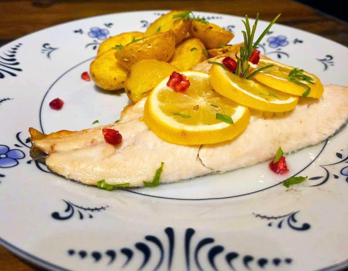 Weihnachts-Saibling aus dem Ofen mit Zitronen-Kräuterbutter, Knoblauch, Rosmarin & Ofenkartoffeln